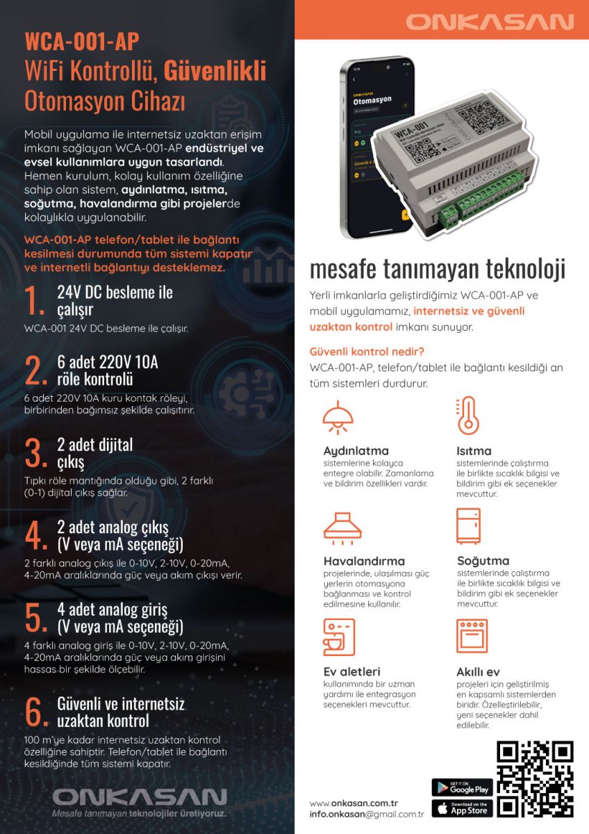 Mobil uygulama ile internetsiz uzaktan erişim imkanı sağlayan WCA-001-AP endüstriyel ve evsel kullanımlara uygun tasarlandı. Hemen kurulum, kolay kullanım özelliğine sahip olan sistem, aydınlatma, ısıtma, soğutma, havalandırma gibi projelerde kolaylıkla uygulanabilir.